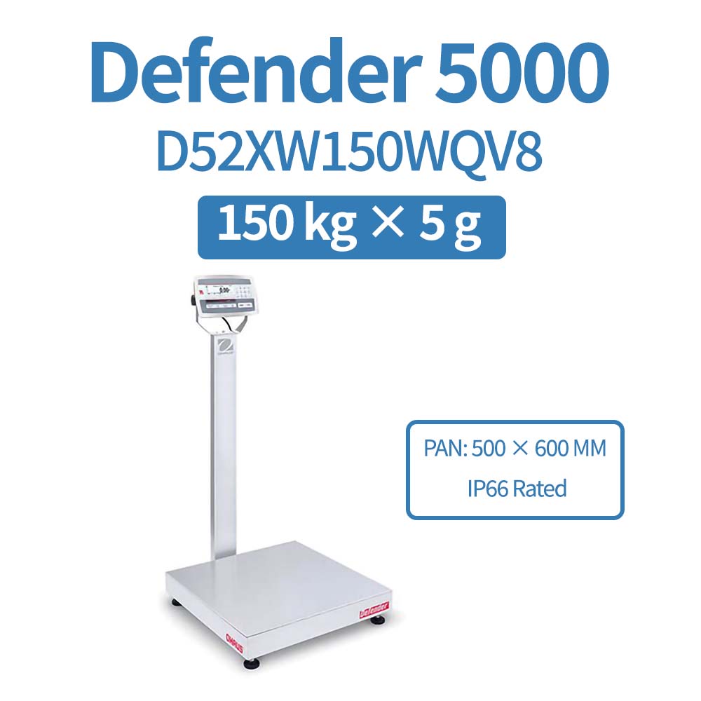 OHAUS Defender 5000 D52XW150WQV8 is a multifunctional stainless steel bench scale designed for industrial and commercial weighing applications. With a capacity of 150 kg x 10 g, it offers fast stabilization and precision performance.