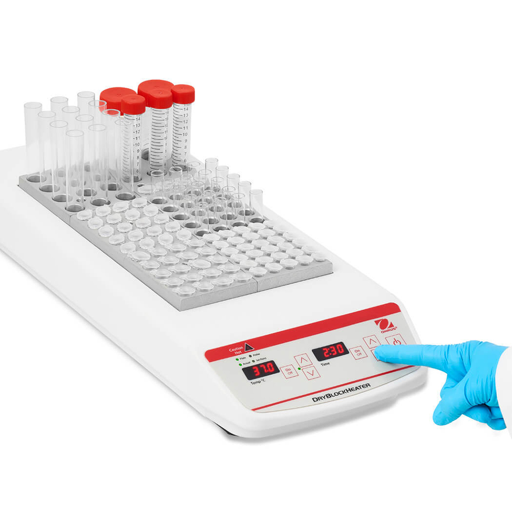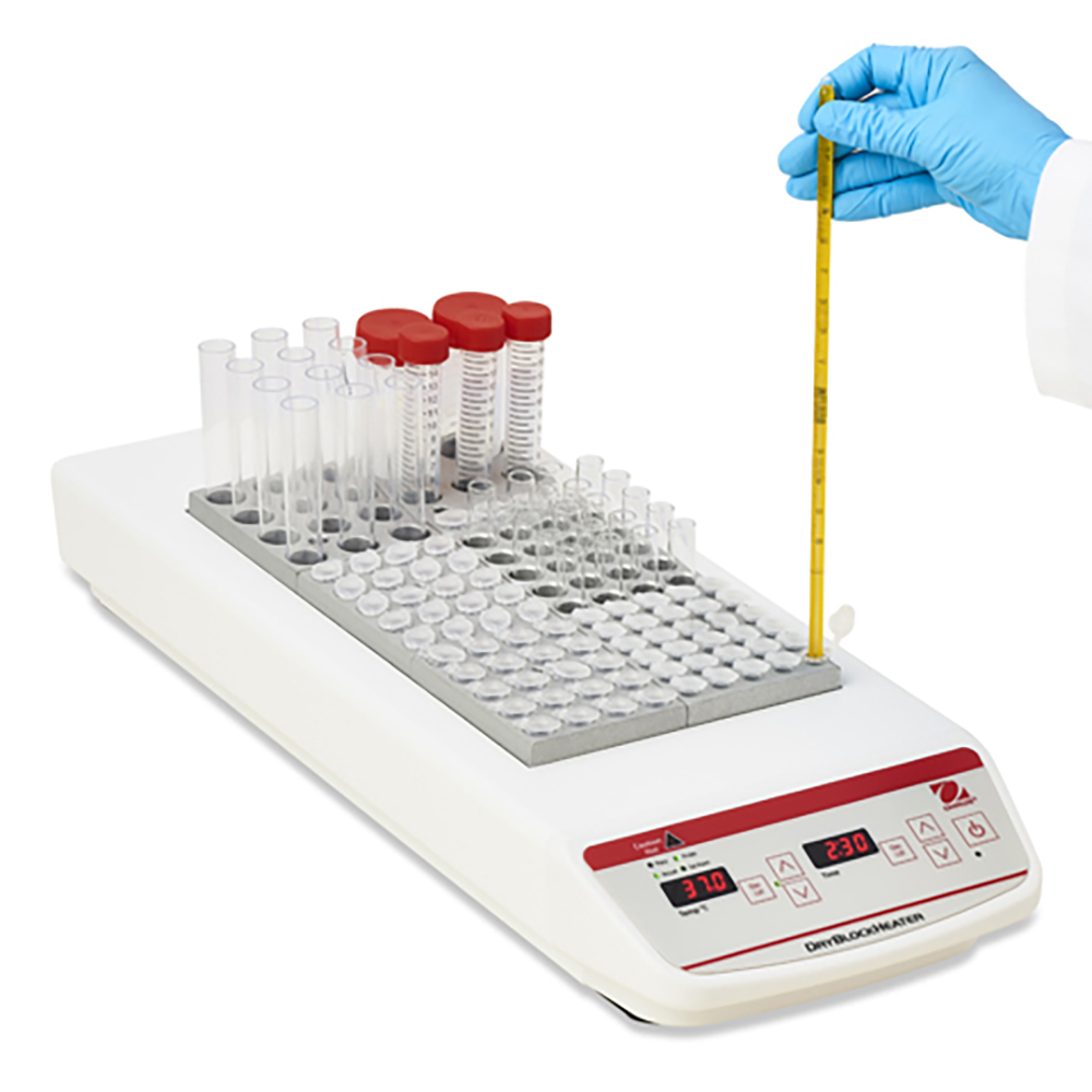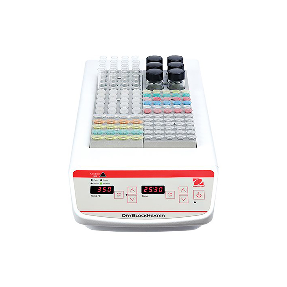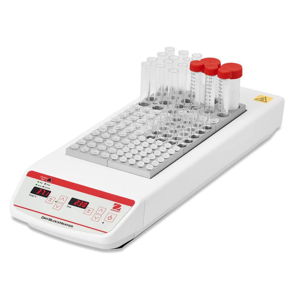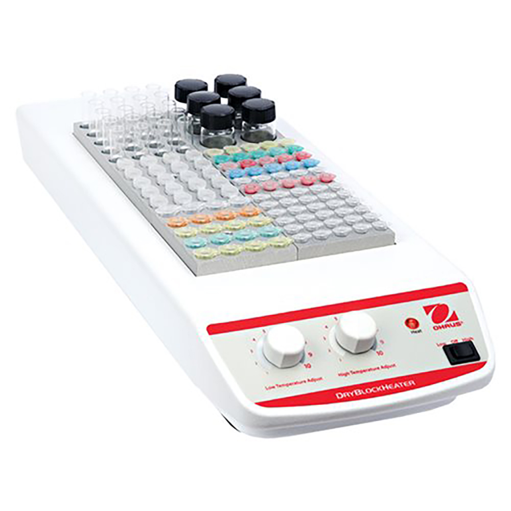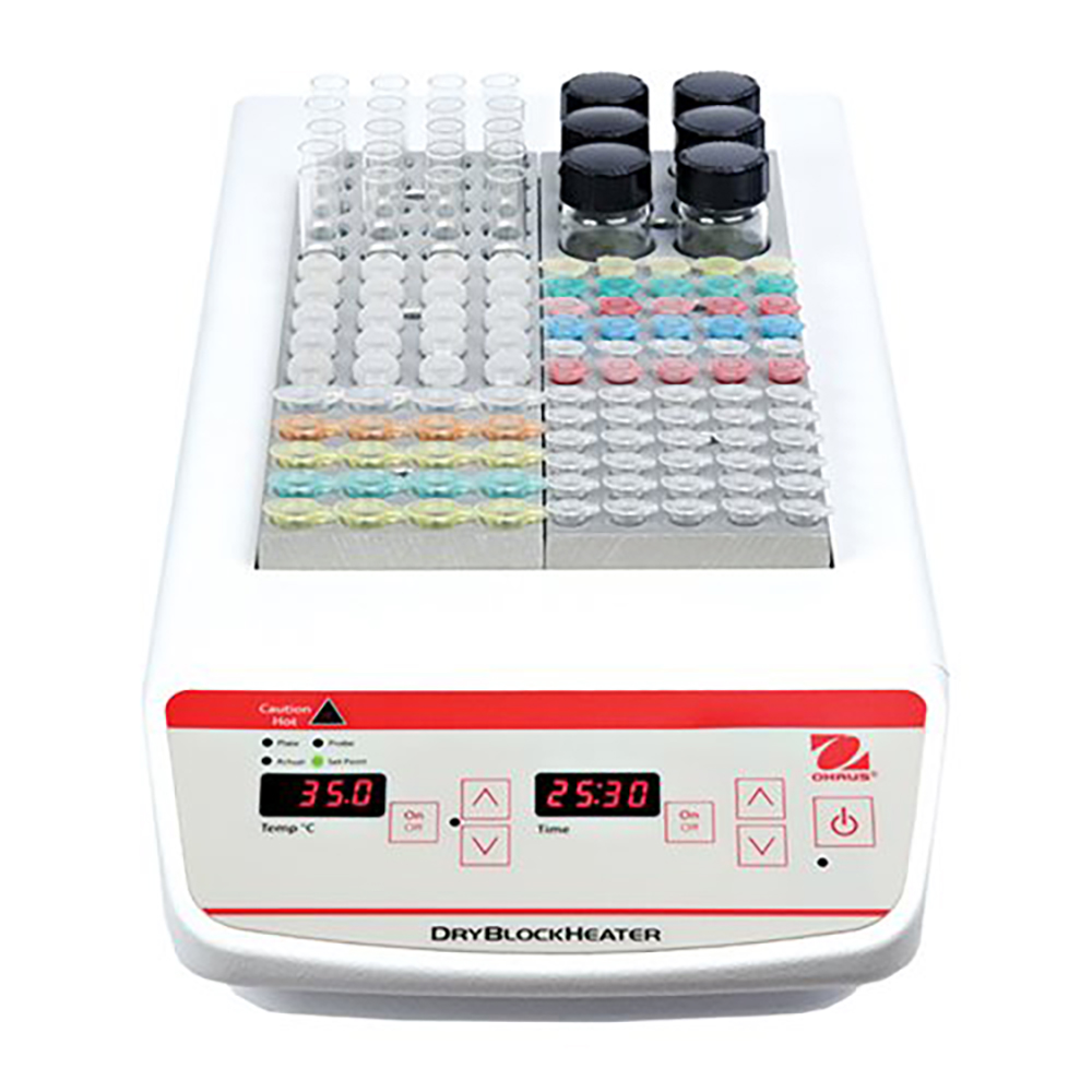 The OHAUS HB6DG Digital Dry Block Heater features six-block capacity for maximum throughput. Digital temperature control maintains uniform heat up to 120 ??C (??0.5 ??C). Ideal for biochemistry, microbiology, and QA/QC labs. 230 V power with LED display, timer, and over-temperature safety.